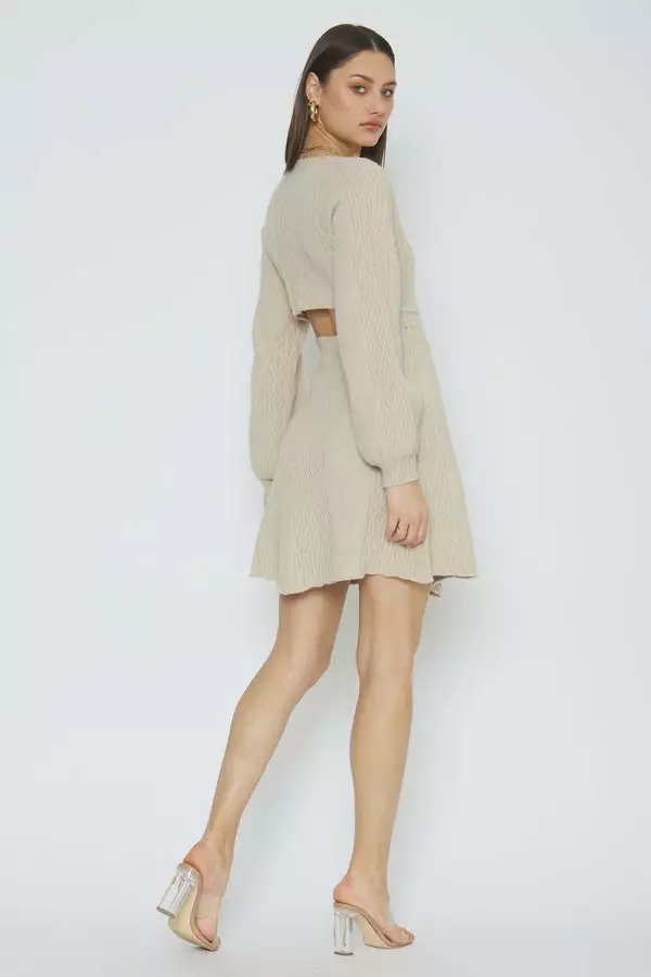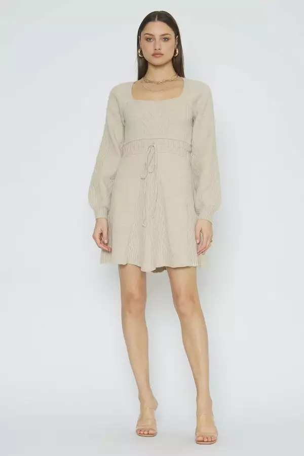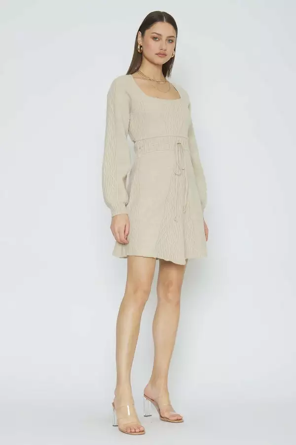 Long sleeve sweater dress with drawstring tie at waist and cut out in back.