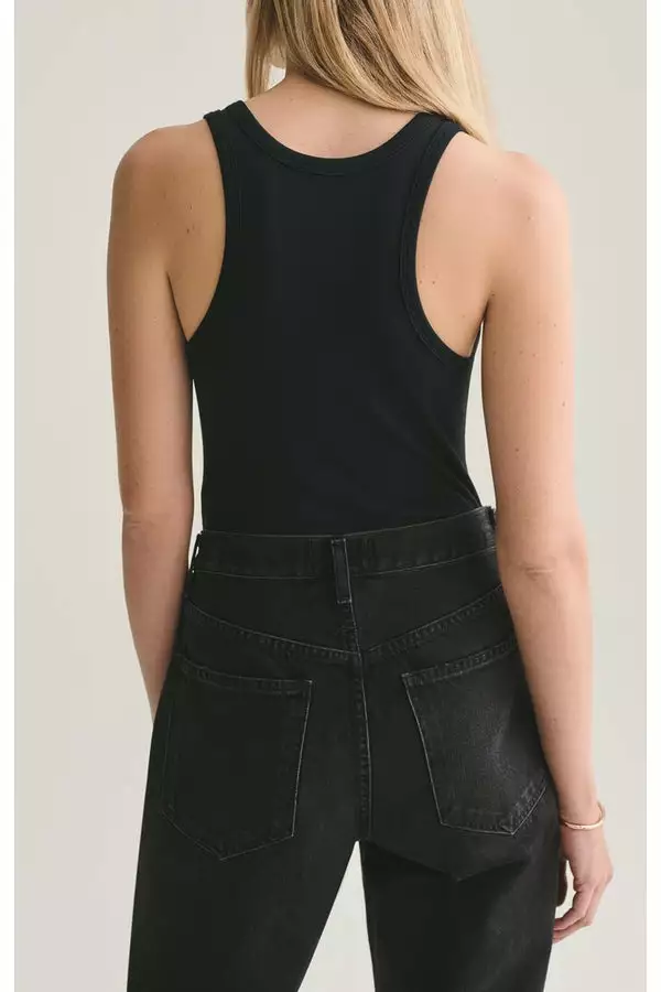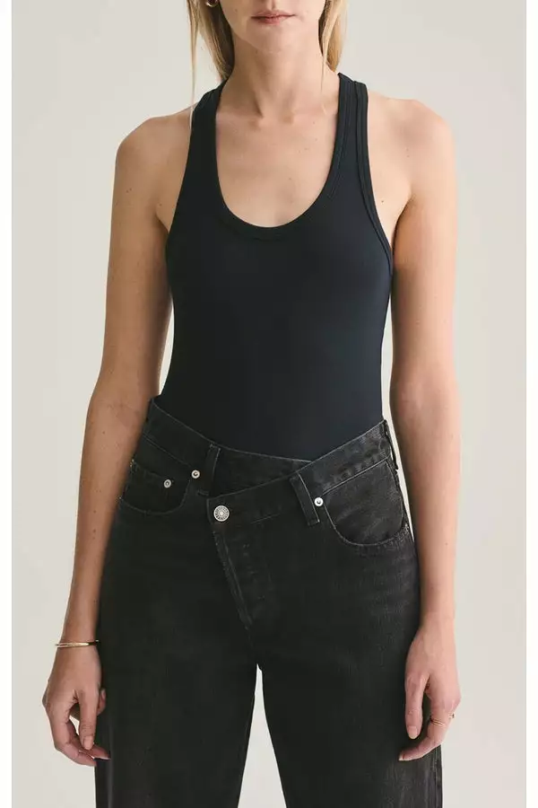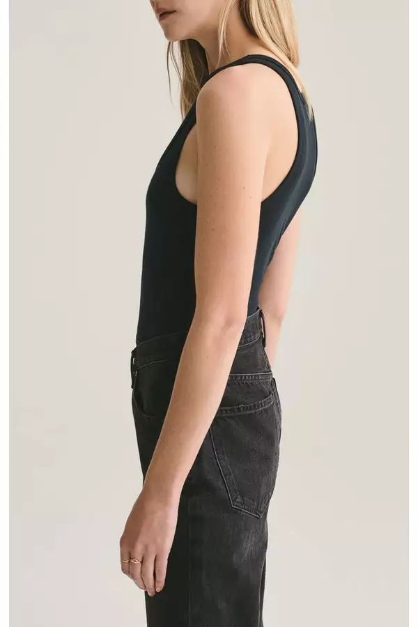 Classic, ribbed tank bodysuit cut in a soft, black jersey.