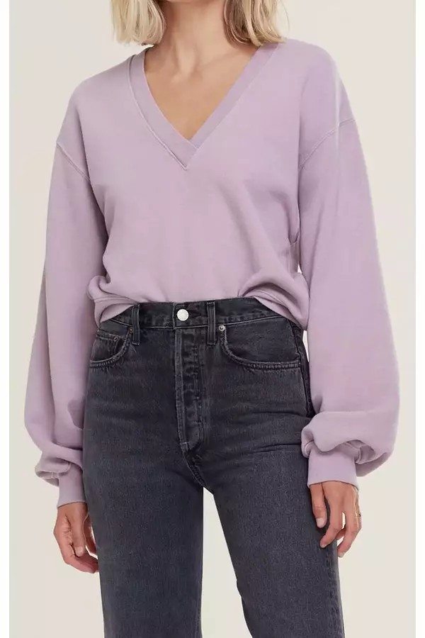 A cool take on a cozy classic. Roomy sleeves and a dramatic v-neck add interest to this staple style. Wear yours with cut-off shorts and a sneaker. Â