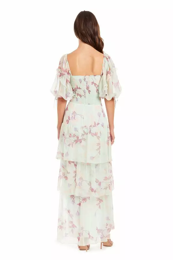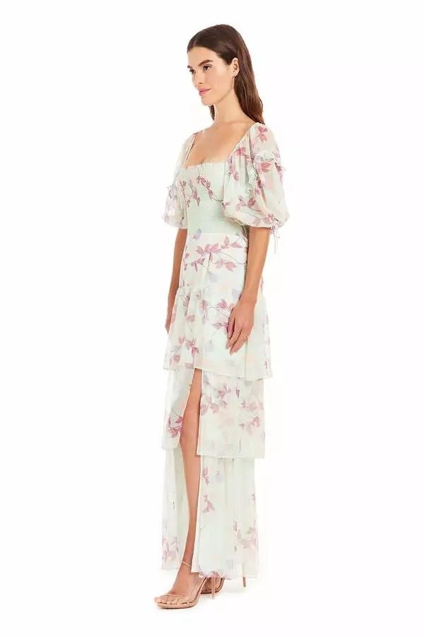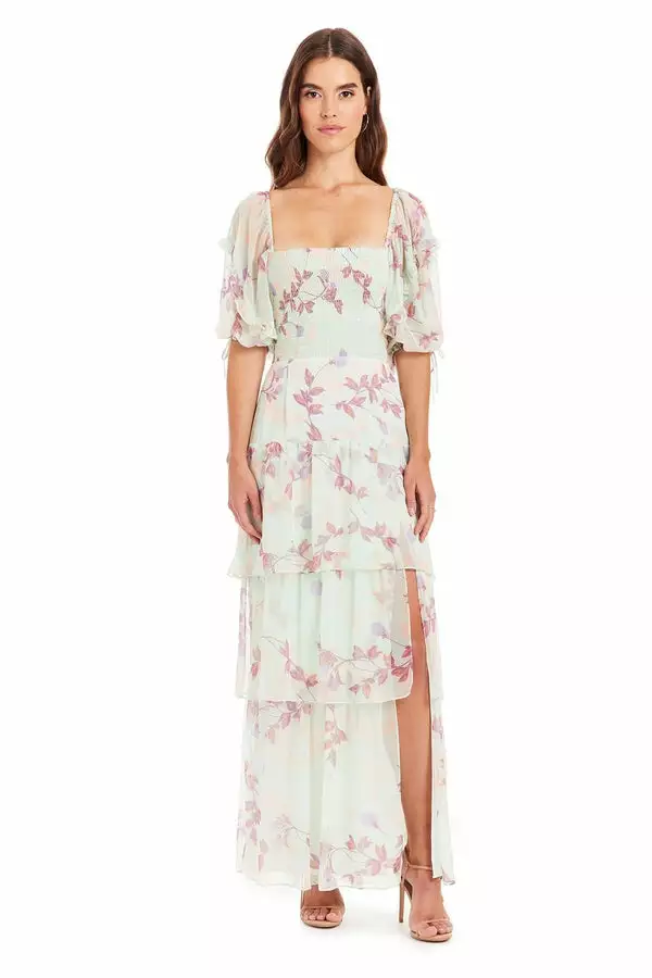 The Florentina Maxi is a timeless closet staple from fun print to it’s chic ruffle details. Feel confident in this figure flattering floor length and a little bit of sexy from the skin-showing slit on the skirt. Make this dress casual by pairing with flat sandals or loafers or make it fancy with heels and colorful earrings.