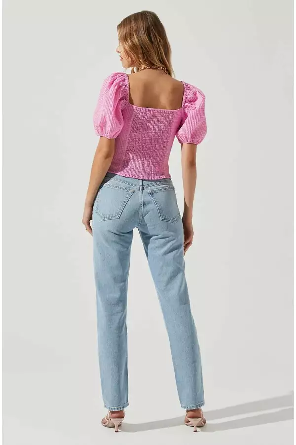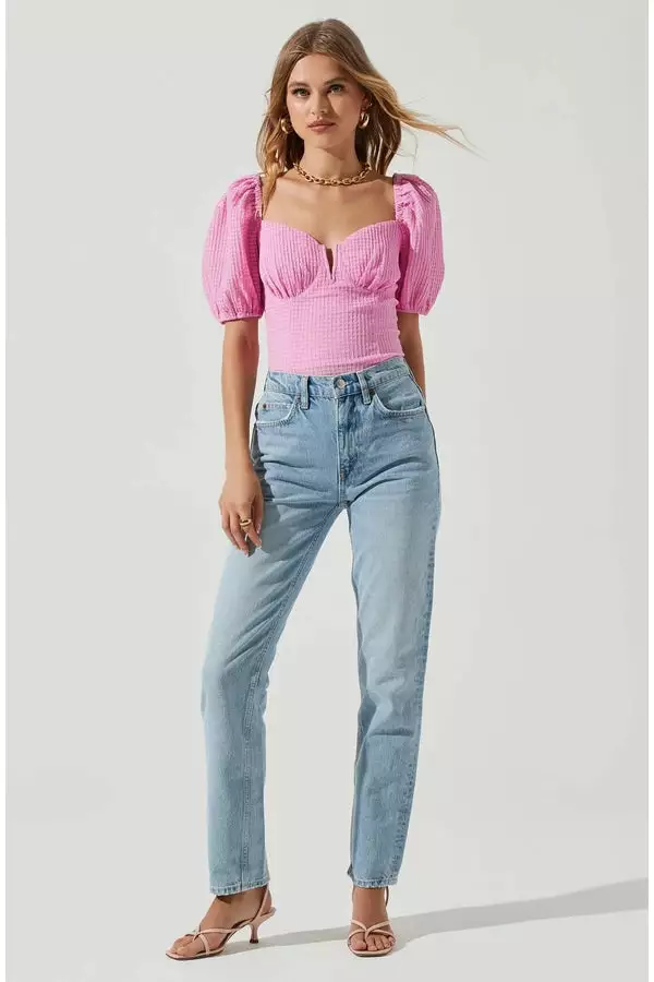 This top features a sweetheart neckline and wired notch accent. Cupped bust leads to a darted bodice. Short puff sleeves. Smocked back.