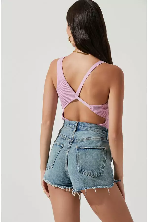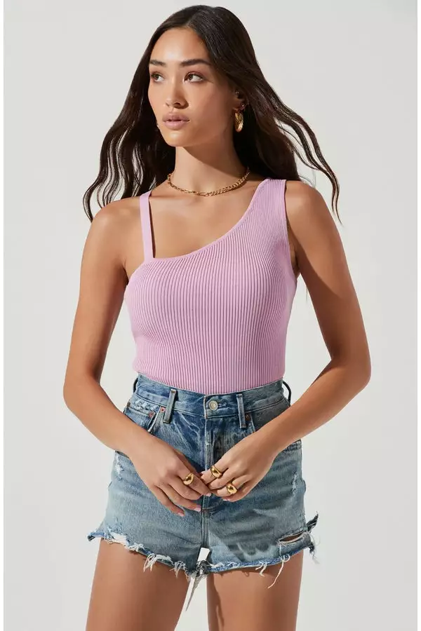 This ribbed knit bodysuit gives your wardrobe a modern twist! It features an asymmetrical neckline with a sleeveless design and back cutout. Attached thong bottoms have snap button closures.