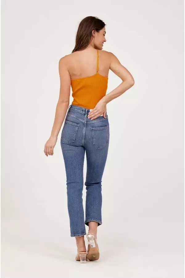 Asymmetrical strap, orange bodysuit.