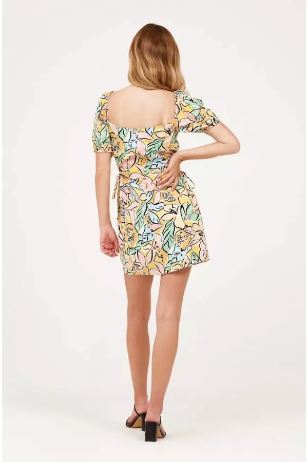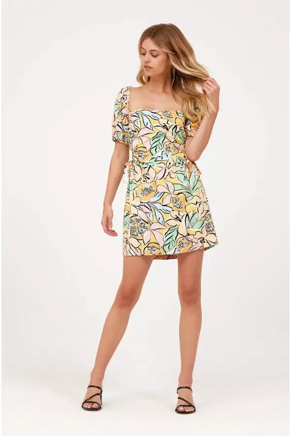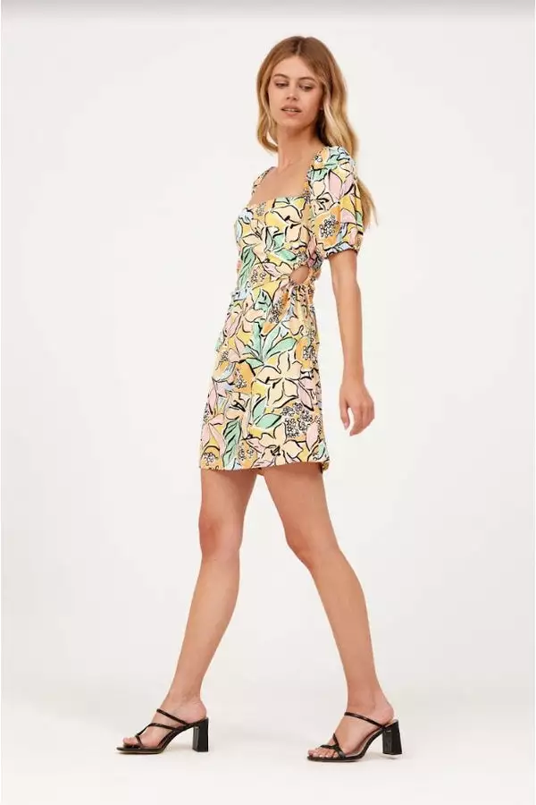 Ready to make a statement! The Talula Dress features a square neckline that leads to double side cutout accents with a drawstring detail. Short puff sleeves.