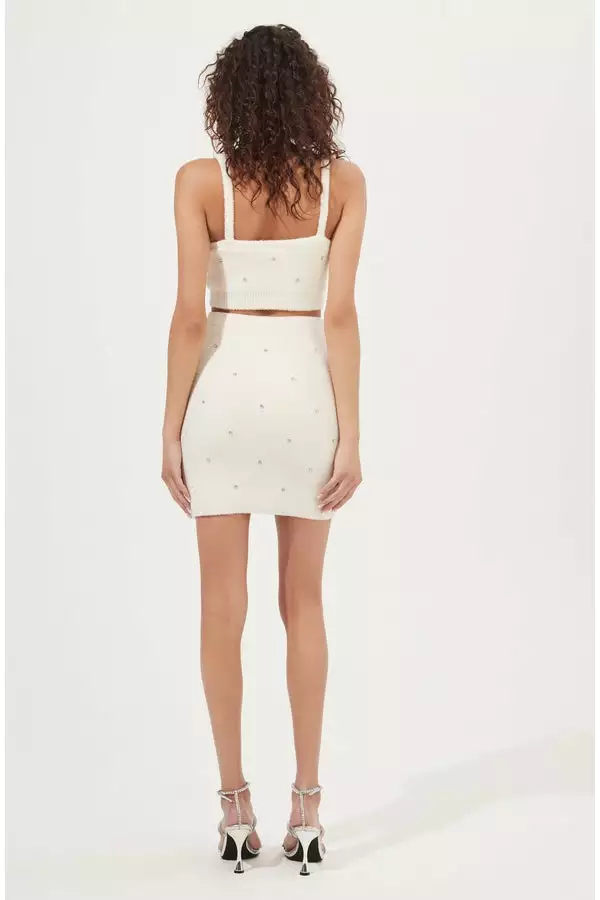 This sweet top features a fuzzy knit construction with a scoop neckline, rhinestone embellishment throughout and cropped hem. Slight stretch. Pair with matching Tea Party Skirt and Tea Party Cardigan!