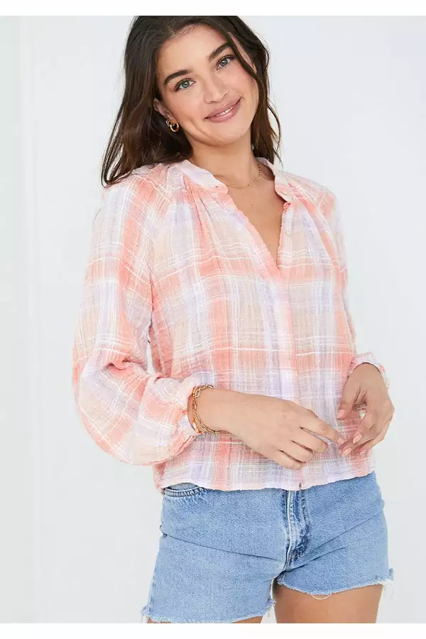This mandarin collar long sleeve button up shirt with shirred sleeves now comes in a soft Coral Plaid pattern. 70% Cotton 30% Rayon Comes in: Coral Plaid