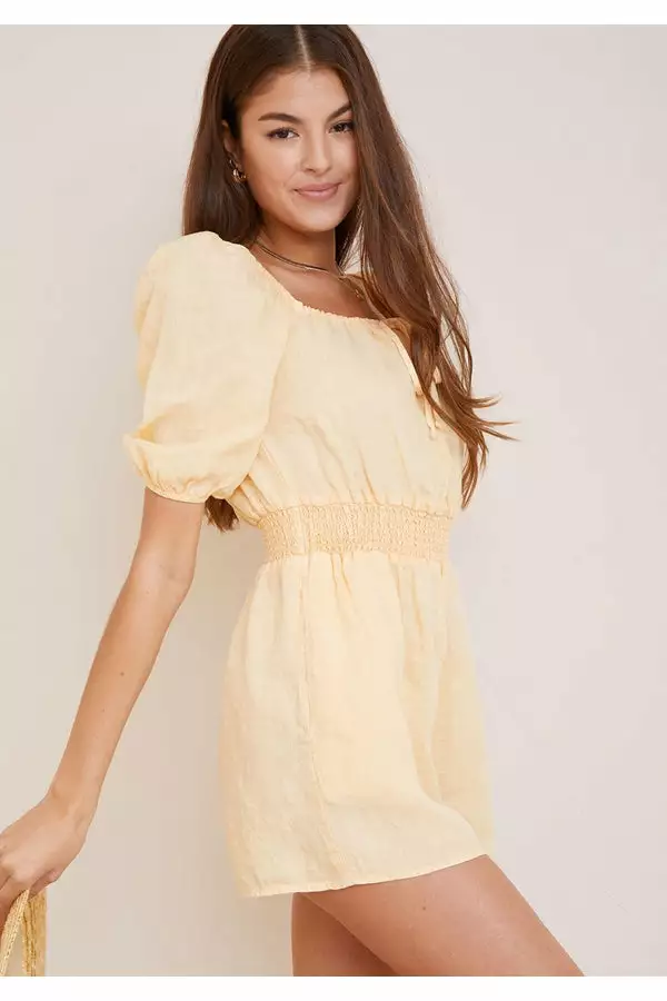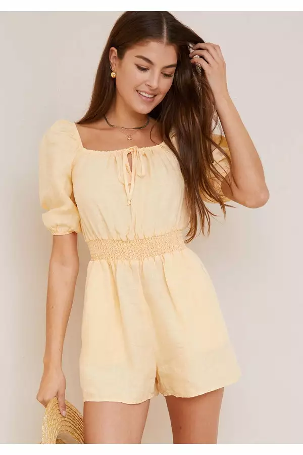 A square neck romper with puffed short sleeves, a key-hole neck tie, and shirred waist detailing. 100% Linen