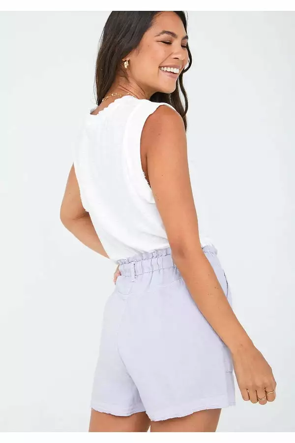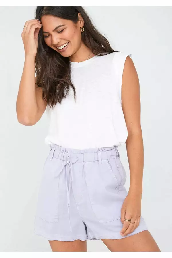 These loose mid-thigh shorts boast a cinched elastic waistband with a tie and front side slit pockets 50% Cotton, 25% Lyocell, 25% Twil