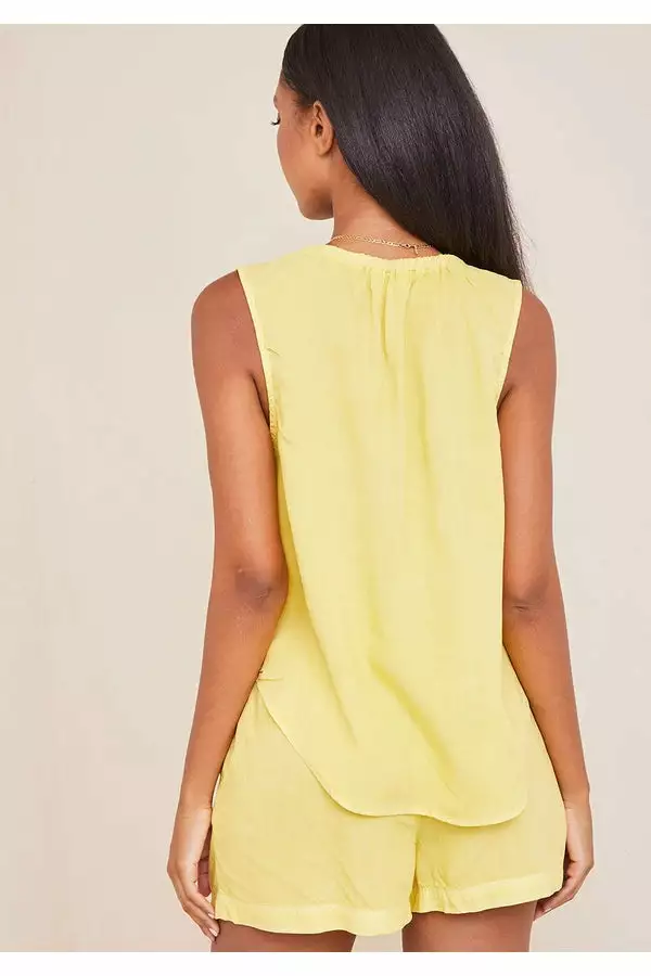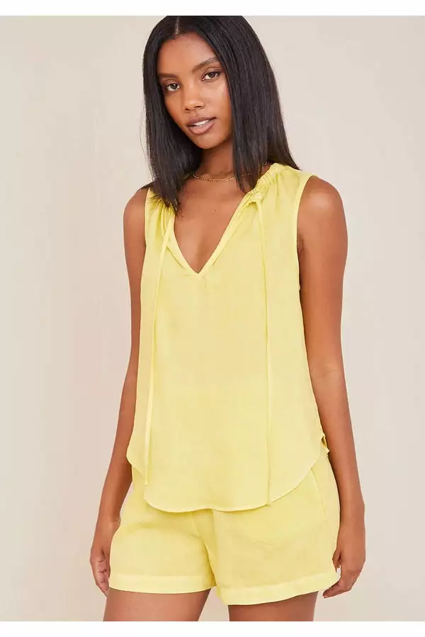 A shirred V-neck sleeveless pullover top with drawstring neck ties. 100% TENCE