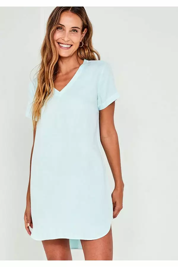 Coveted for its simplicity, this effortless dress features a V-neck, flowy fit and slightly longer back hem. This V-Neck Short Sleeve T-Shirt Dress is a great base for any season!