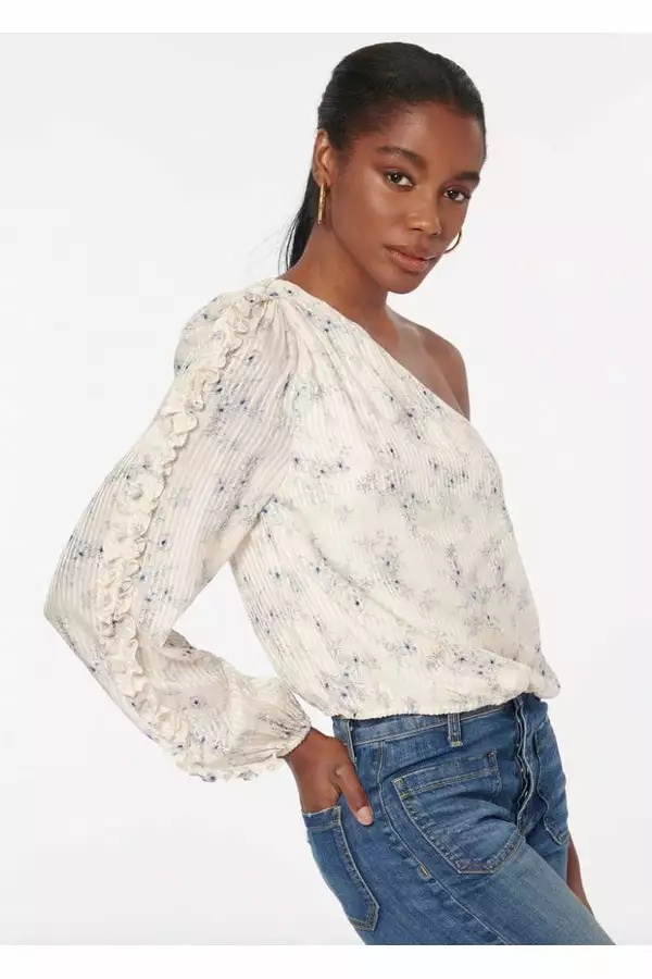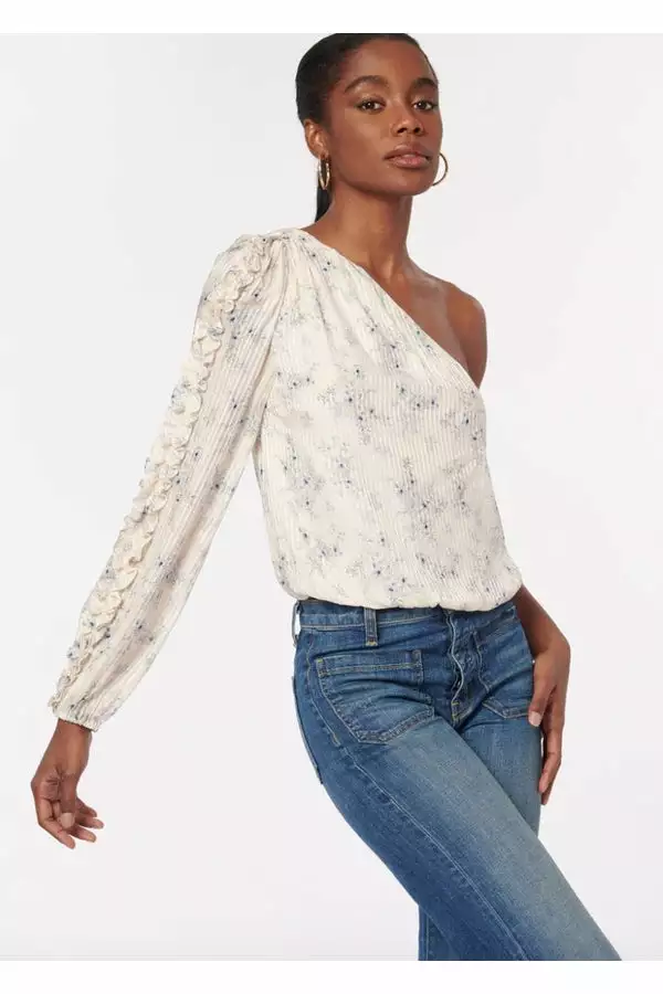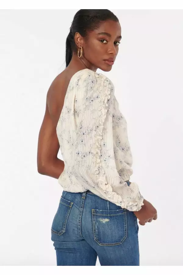 introduce our new Spring favorite: the Lotus. Constructed in a luxurious silk cotton blend, the Lotus is a long-sleeve one shoulder blouse featuring a delicate ruffle detailing along the balloon sleeve. This asymmetrical style is finished with a tunneled elastic at the hem and at the sleeve opening. Now available in Forget-Me-Not, a soft cerulean blue Spring floral atop a solid ivory-based ceramic hue.