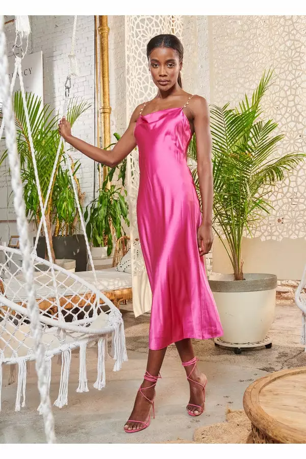 Re-introducing our customer favorite Shallon Dress for our Holiday collection. Inspired by our Busy Cami, the Shallon Dress is a slinky midi length bias dress designed with a cowl neckline and finished with delicate baroque pearl chain straps. The Shallon is fully lined. Now in Magenta: a bright and Spring-forward pop of pink