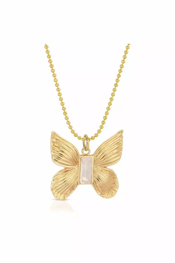 The mini version of our best selling butterfly necklace. Genuine cracked mother of pearl emerald cut baguette with CZ details on wings.Â