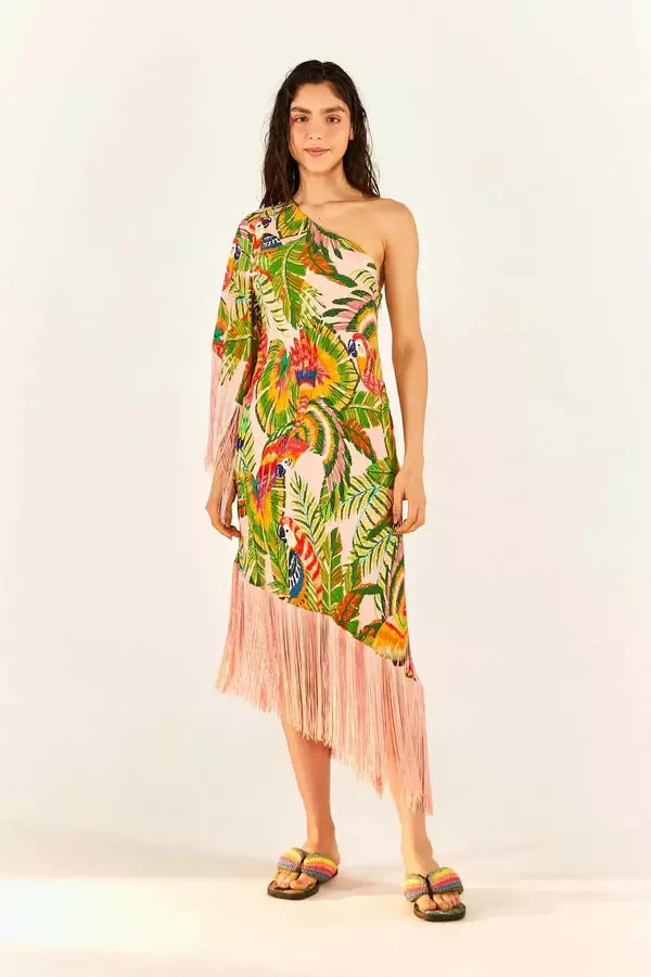 You’ll be Summer-ready with this tropical fave! The Macaw Leaves One-Shoulder Midi Dress brings one of our must-have prints full of colorful nature. It also features a slim fit with a standout neckline, and some fringes to drop jaws around you.