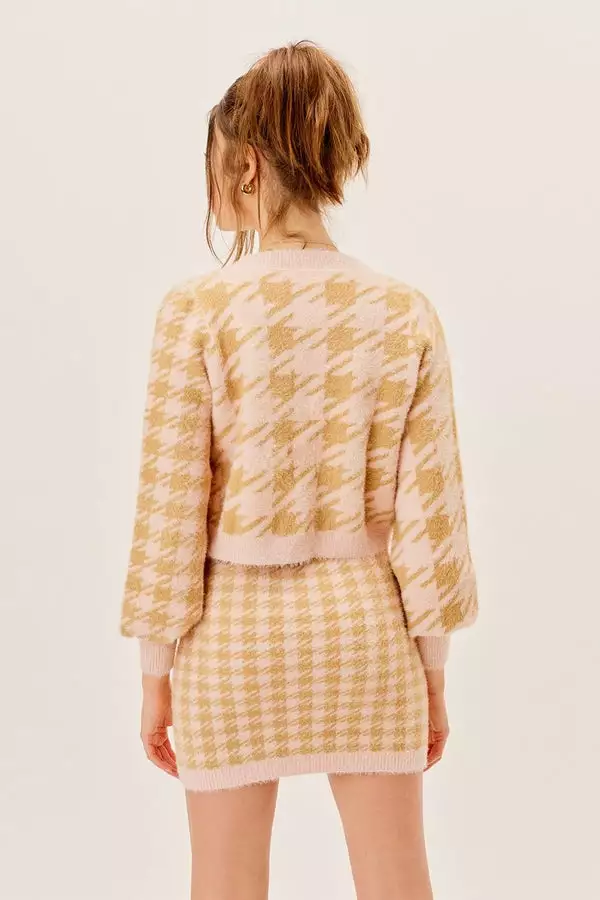 We’ve updated our iconic faux mohair Cher Cardigan! Featuring a girly houndstooth print and pink tonal buttons. Cropped fit, crew neckline. Pair with matching Cher Tank Sweater and Cher Mini Skirt.Â
