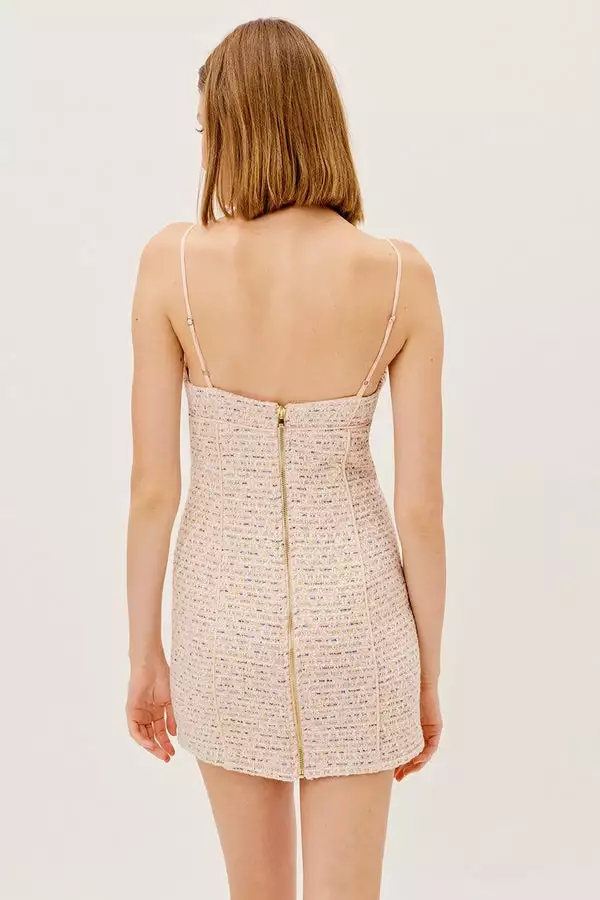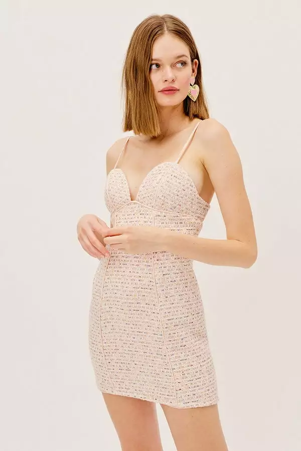 Chic textured tweed mini dress featuring a structured sweetheart bust, feminine contrast pink piping, and delicate shoulder straps. Fitted silhoutte.
