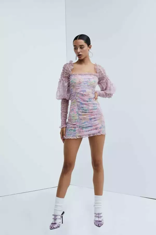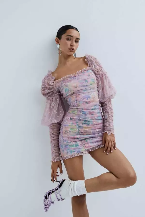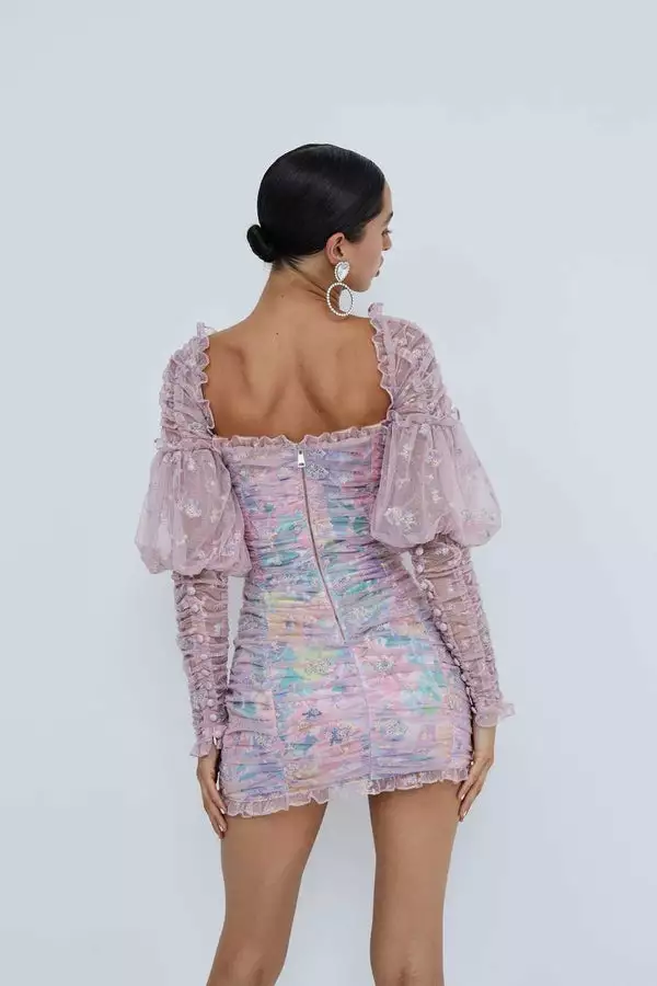 Dreamy mini dress featuring embroidered maisonette mesh and ruched detailing throughout the body-skimming silhouette. Ethereal poet sleeves, pastel-printed eco-friendly lining. Exposed zipper at back.