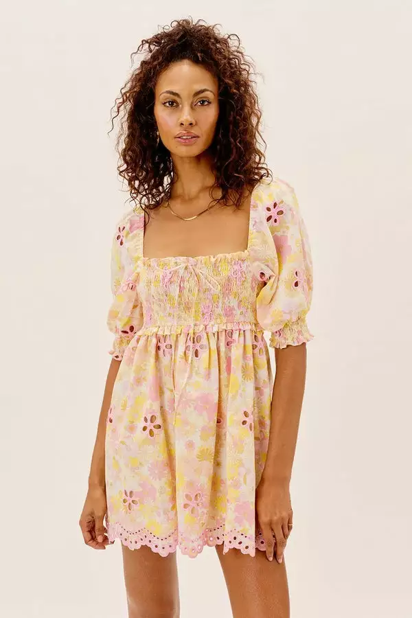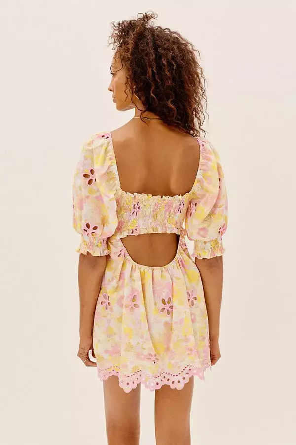 Sunny flower power print embroidered mini dress featuring a smocked bodice, sweet scallop trim, and pretty puff sleeves. Dramatic keyhole back with adjustable drawstring. Partially lined.