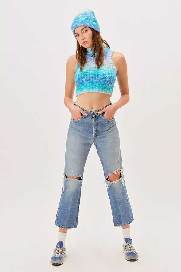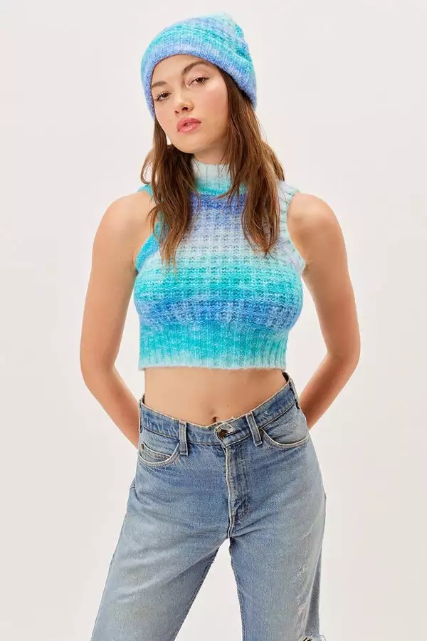 90s-inspired waffle knit ombre stripe cropped tank sweater featuring a dramatic open back. Due to the nature of the ombre detail & knitting process, every piece is unique and will differ slightly from the image on our site.