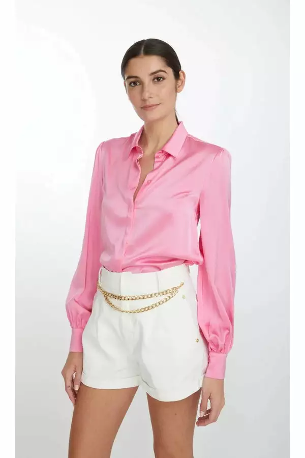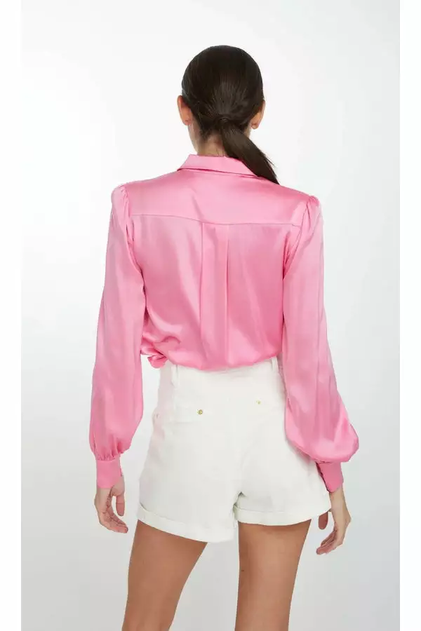 Our take on classic shirt styling make this ultra luxe blouse an absolute wardrobe essential! Smooth, fluid, stretch silk charmeuse blouse with voluminous sleeves and clean hidden placket.