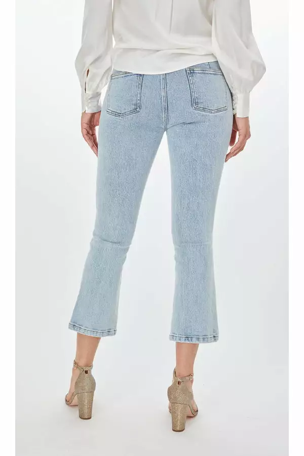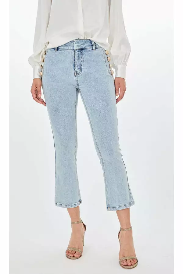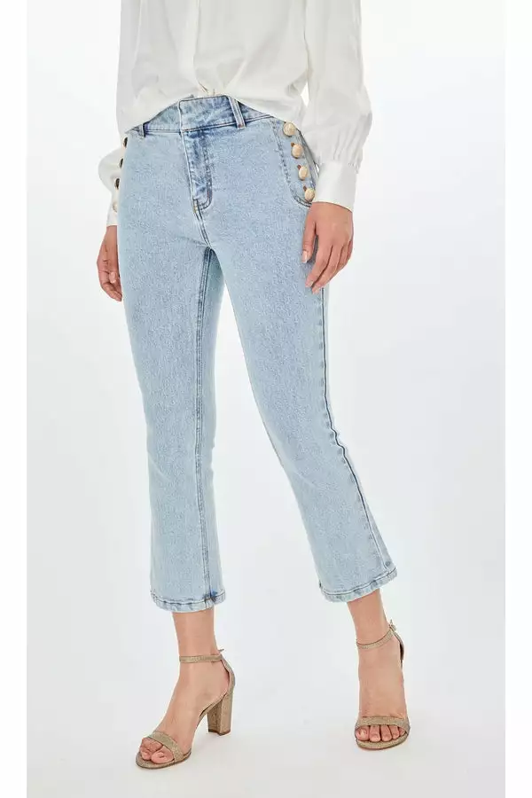 Show your personal flare with these super fun, super soft, stretch denim jeans that kick out at the cuff. Back pockets and light gold embossed laurel wreath front buttons complete the true-to-size, slim-fit look.