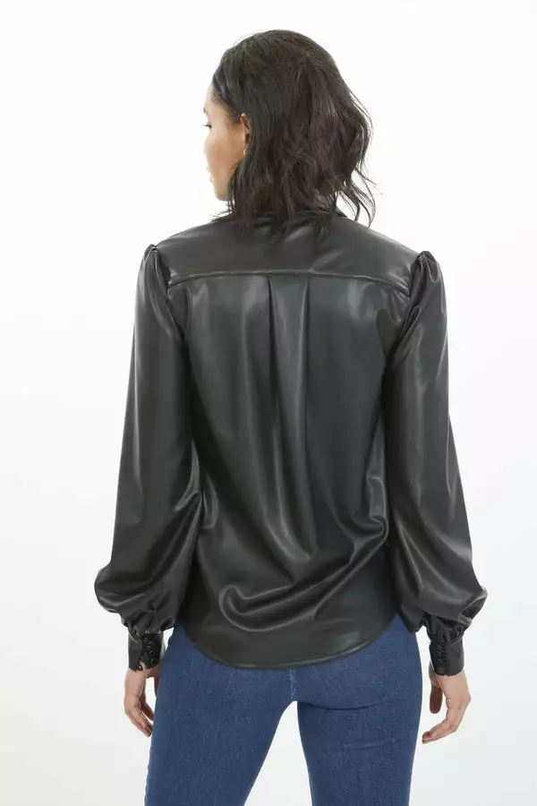 Socially conscious vegan leather never looked or felt better than in this way soft and stretchy, button-down blouse. Dramatically voluminous puff sleeves and buttoned cuffs complete this testament to casual chic.