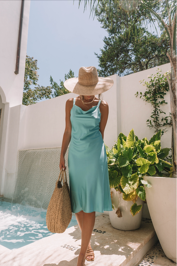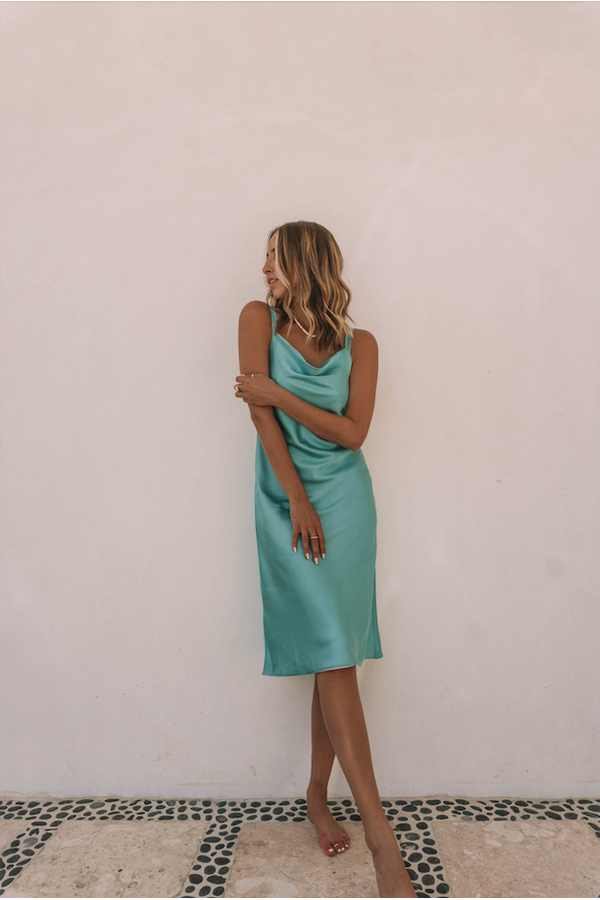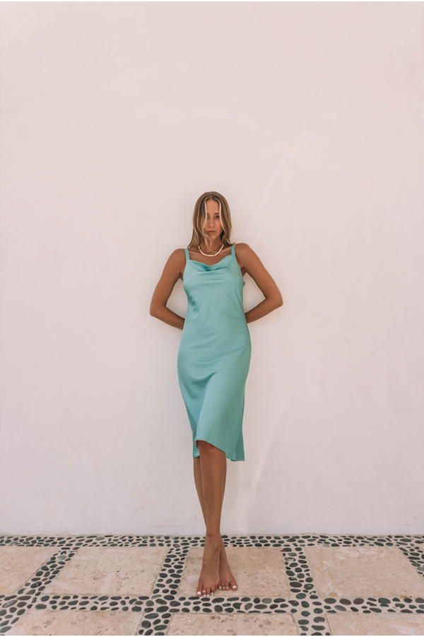 Hemline Exclusive Rebecca Midi Dress in Mint. This satin slip dress is perfect for a night out or through over a tee shirt and pair with sneakers for a casual day time look!