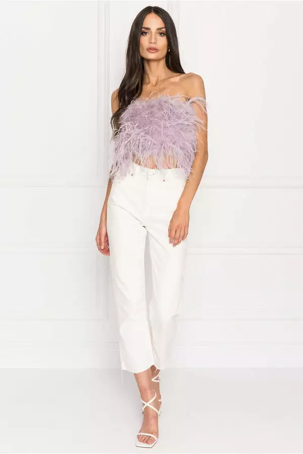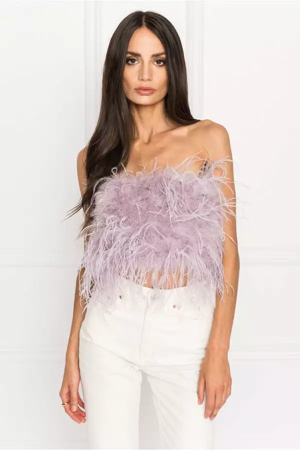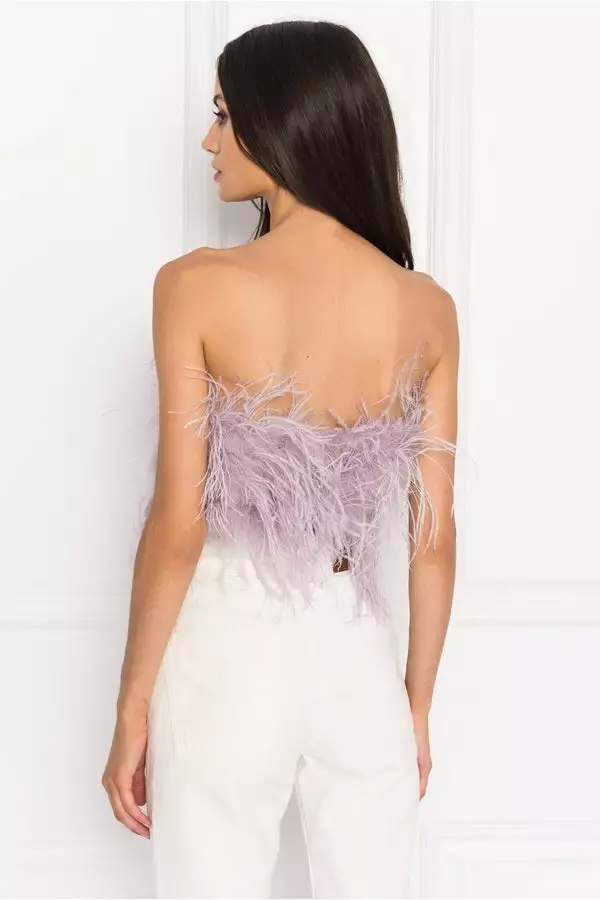 For a more decadent approach to dressing up, opt for the Zaina cropped bustier. Mixed feathers offer eye-catching flounce and alluring texture. A back zipper closure seals you in for a close fit.