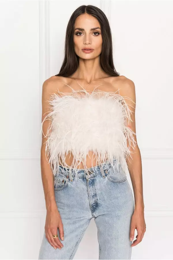 For a more decadent approach to dressing up, opt for the Zaina cropped bustier. Mixed feathers offer eye-catching flounce and alluring texture. A back zipper closure seals you in for a close fit.