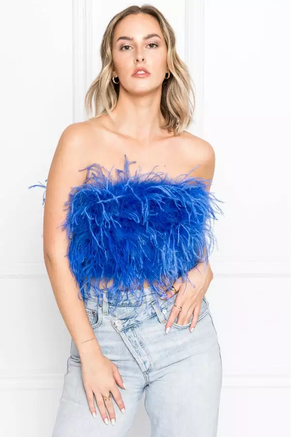 For a more decadent approach to dressing up, opt for the Zaina cropped bustier. Mixed feathers offer eye-catching flounce and alluring texture. A back zipper closure seals you in for a close fit.