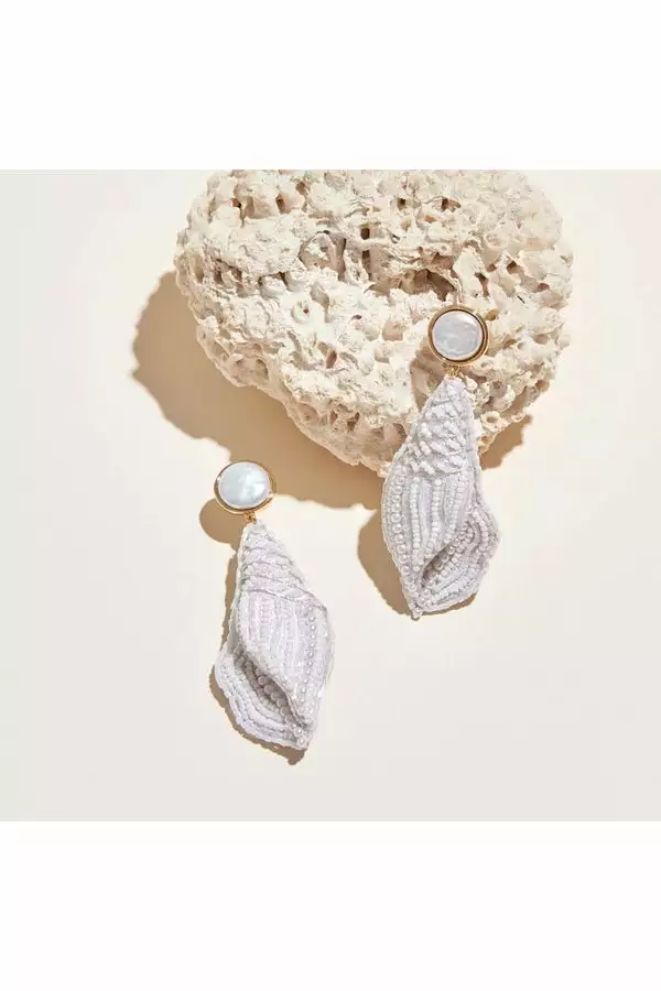 Nostalgic of warm-weathered trips past, the regal conch shell is comprised of hundreds of light-refracting see beads.Â