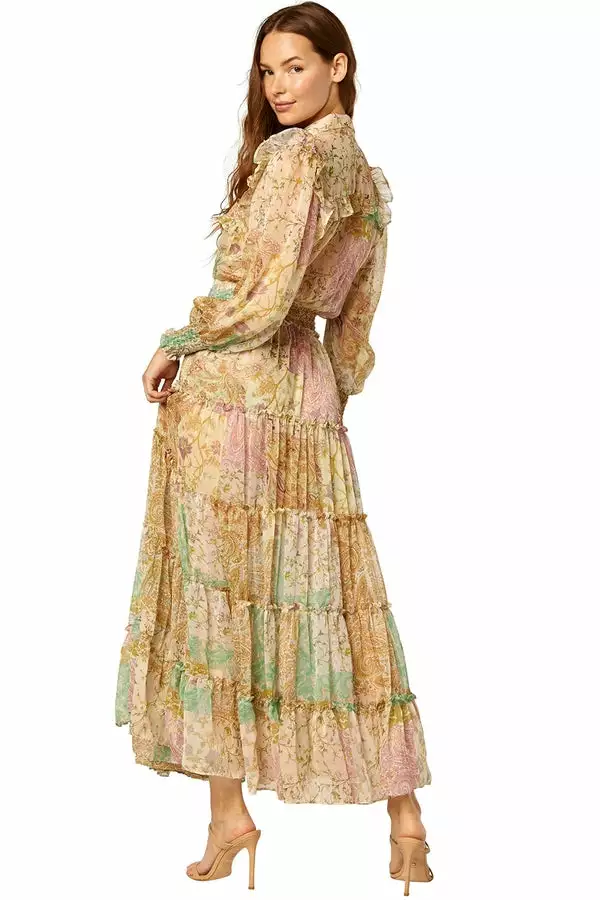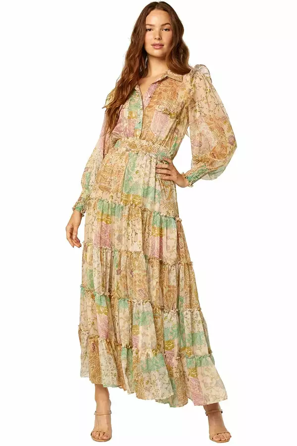 Our classic Aydeniz maxi dress is back in a stunning patchwork crinkle chiffon motif. This versatile style is the epitome of sophistication, featuring a button shirt bodice with ruffle trimmed chest pockets and a sweet ruffle detail at the shoulders that lead into semi-sheer long sleeves. A covered elasticated waist leads into a flowing long skirt with tiered delicate ruffle details.