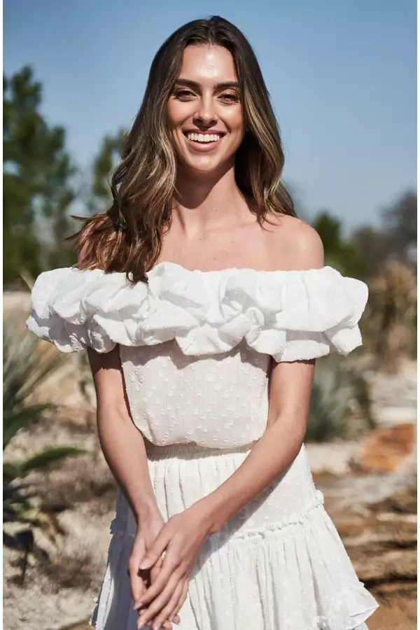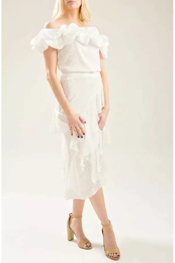 A stunning piece that transitions effortlessly from day to dinner. Handcrafted from a whimsical clip dot chiffon with lurex Complete the set with the coordinating Marion Skirt or Carmen Skirt.