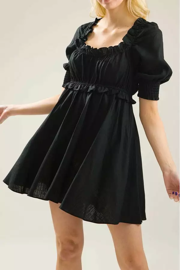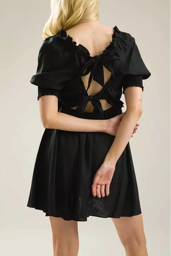 The Ara dress is an beautiful black babydoll dress. With tie back detailing, this feminine style dress is an easy addition to your spring wardrobe!