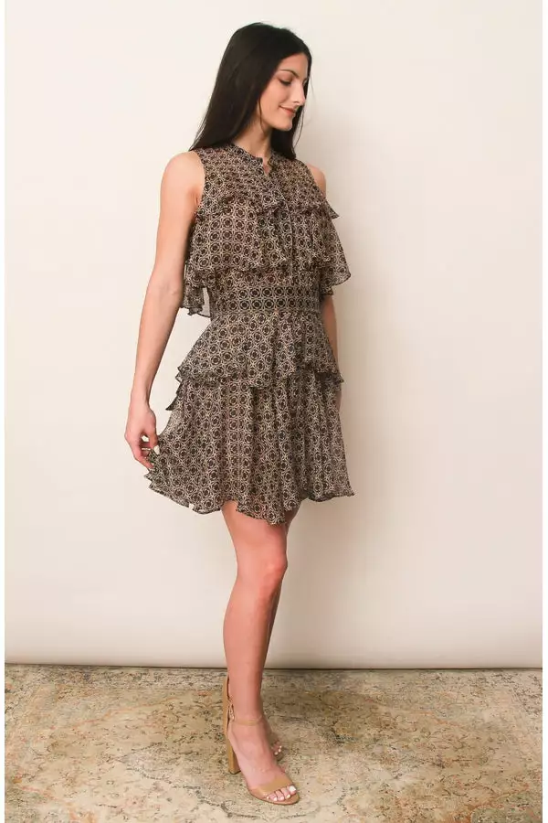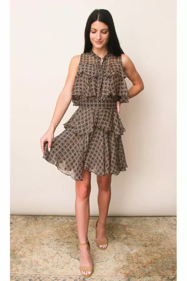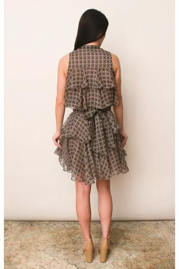 Emogene is a swing shift dress can be worn with the optional tie-belt or left loose for a truly chic look. Featuring tiered ruffles starting at the hidden button chest placket and continuing to the skirt. This sleeveless high-neck style is cut from gorgeous navy and tan tile print chiffon. An effortless style for this season and beyond…