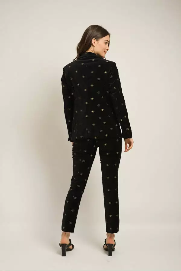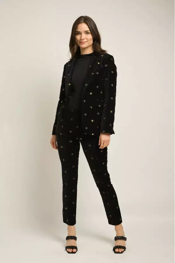 Make a statement in the Iris pants, cut from a black velvet with a hand-embroidered goldeneye motif, perfect for this season and the next. Featuring a side zipper with a hook-and-eye closure and a straight hem. Style with our coordinating Catroux Jacket for the perfect holiday-ready set.Â