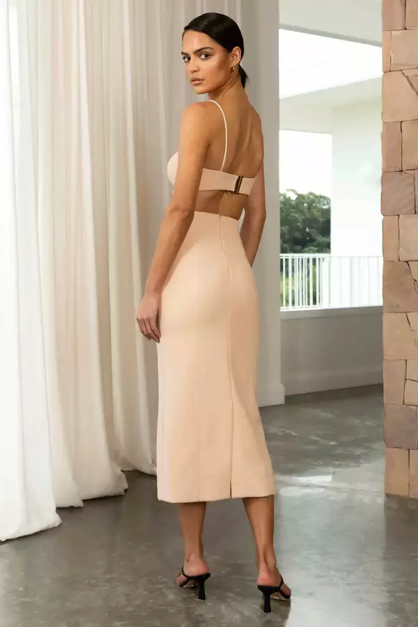 The Daisy Midi Dress will have your outfit sorted for any occasion from day to night with its stunning structure and sweet Shell Nude colour. Featuring supportive bust cups, rouleau straps, subtle waist cut-outs, back fastening with gold clasp feature and classic straight skirt profile. Pair your Shell Nude Daisy Midi Dress with nude heels or be daring with a touch of turquoise blue shoes and statement earrings to match