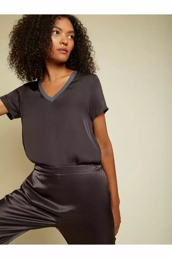 The V neck version of your favorite luxe Sateen tee with a laid-back Recycled Cotton neckband. Sexy, effortless, and already a classic.