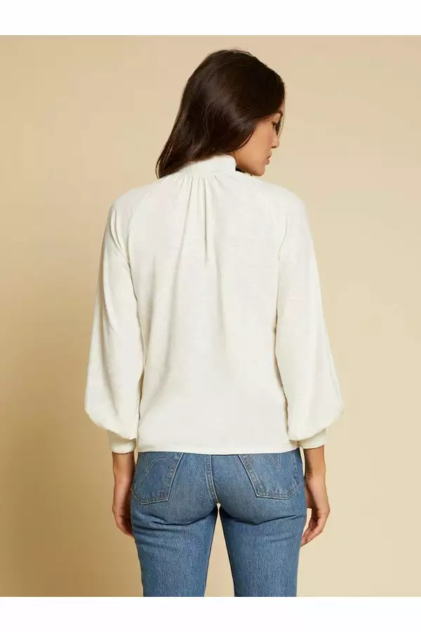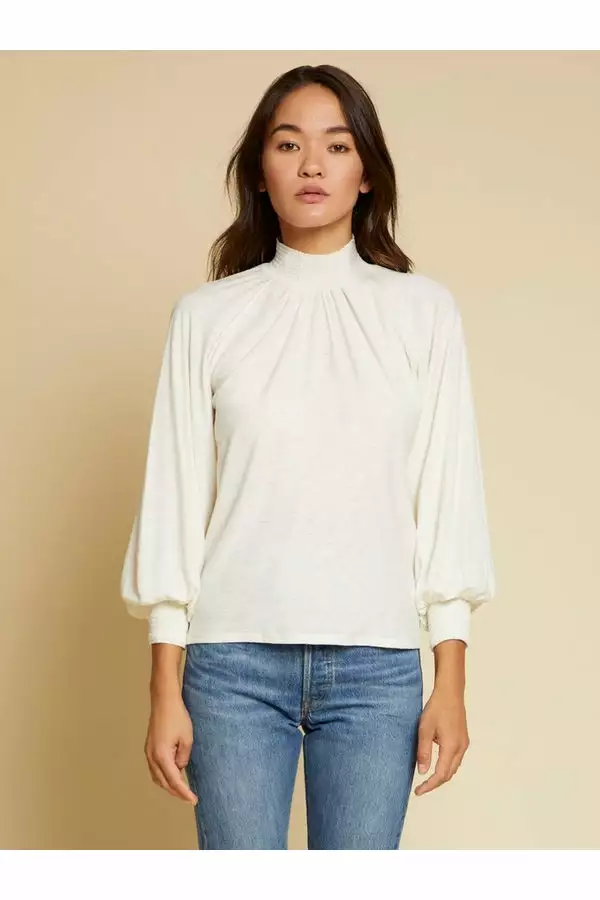 This peasant style tee with its high neck and tall smocked cuffs is the definition of 70s sexy. Bracelet length sleeves.