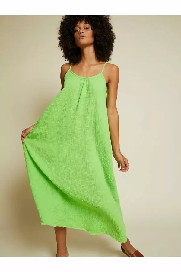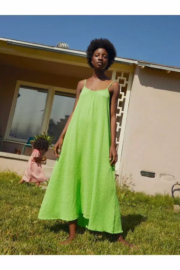 The oversized silhouette of the trapeze dress gets a modern update with a raw hem. It’s the Double Gauze dress that every girl wants to wear.