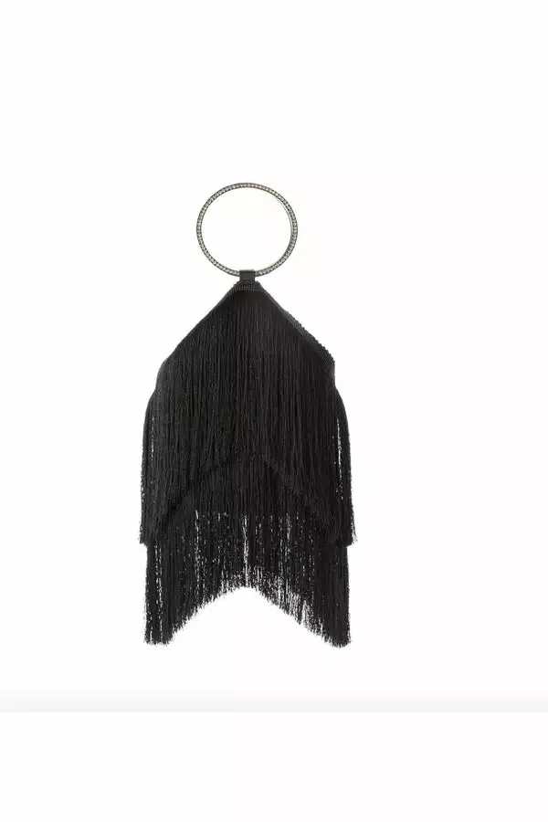 Featuring stunning crystal encrusted metal ring handles and a soft body that’s covered in 2 tiers of fabulous black fringe, the PENOLA Fringed Handle Bag is super fun and flirty and big enough to fit all of your event essentials including a large smart phone.