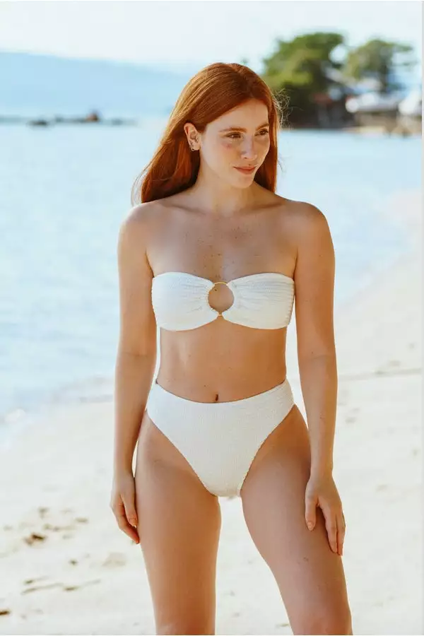 This adorable bandeau features a gold ring, detailed fabric, and a tie closure for an adjustable fit. We love this top paired with the Pure High Waist bottoms. Features removable padding and straps.