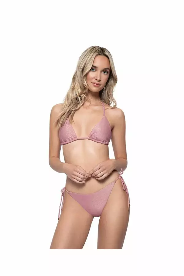 This Namaste Tri Top will be the perfect addition to your vacation wardrobe this season. A classic triangle top with a beautiful shimmer. Make sure to complete the look with a pair of matching Namaste tie bottoms.  Â