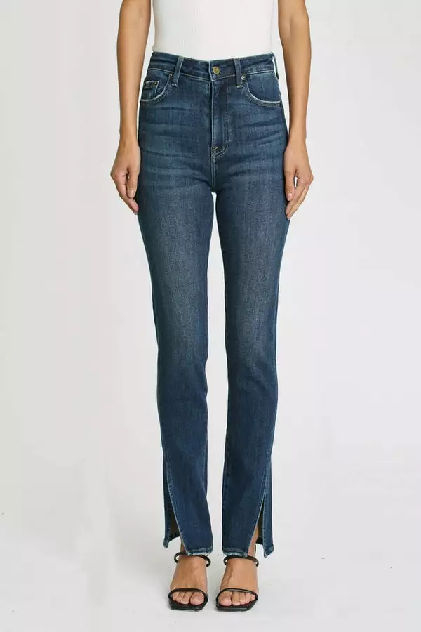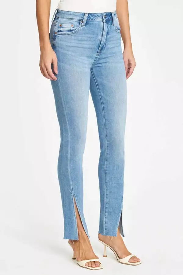 This style comes in a medium wash denim with a metal button closure, a zip fly, and contrast stitching. The Teagan has a chic slit detail at each ankle — the perfect complement to a statement shoe.Â