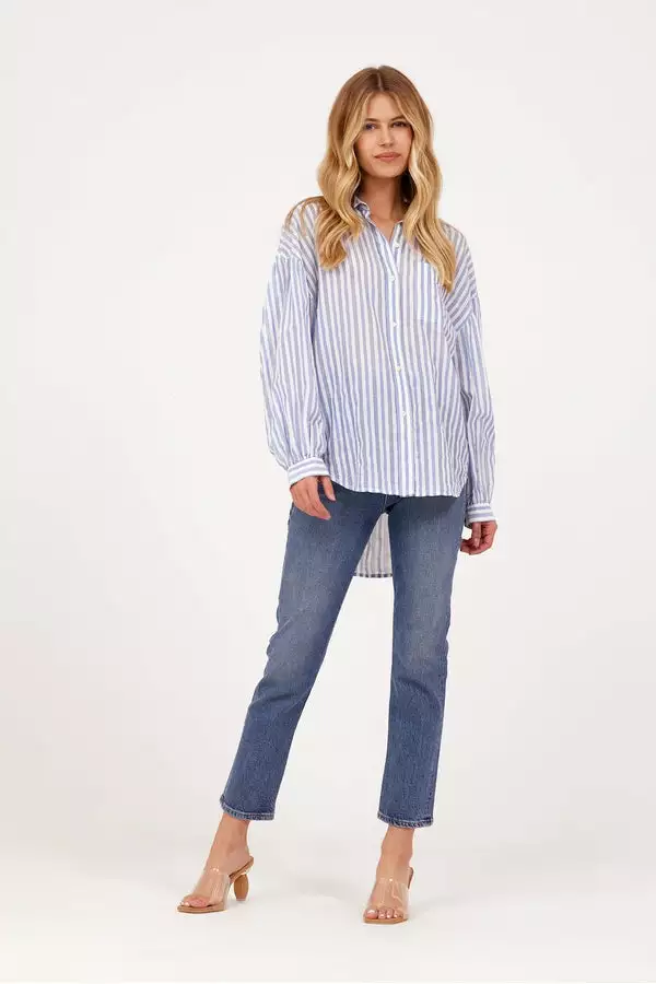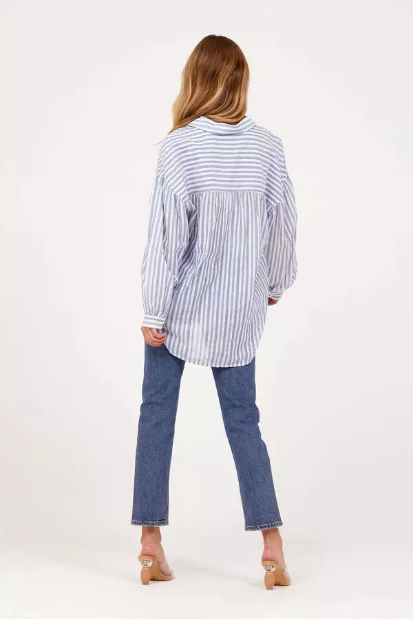 Look polished from work to weekend in this feminine take on the classic button-down shirt. Made from lightweight, textured beach cotton, this soft white collared button-down shirt comes in an oversized fit and features a dropped shoulder, patch pocket at chest, and full sleeves with shirring.
