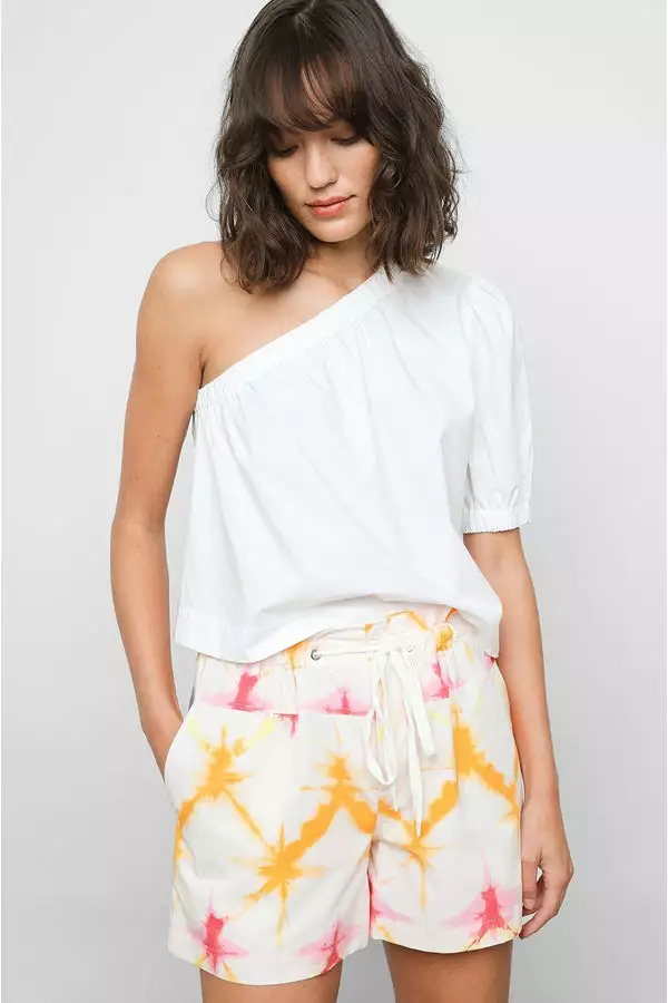 multicolor diamond tie dye design throughout, elastic waistband, two-button and zipper closure, natural drawcord, gromet drawcord openings, front pocket, back patch pockets, and wide leg. These stylish, vintage athleticwear inspired pullover shorts feature crisp cotton-tencel blend fabric in beautiful sunburst hues for an elevated update to the classic surf short.