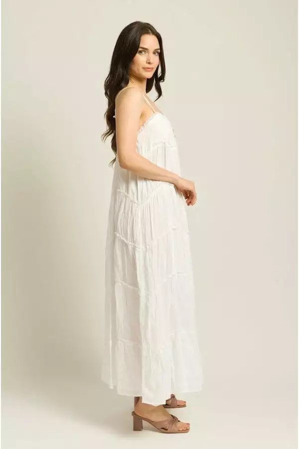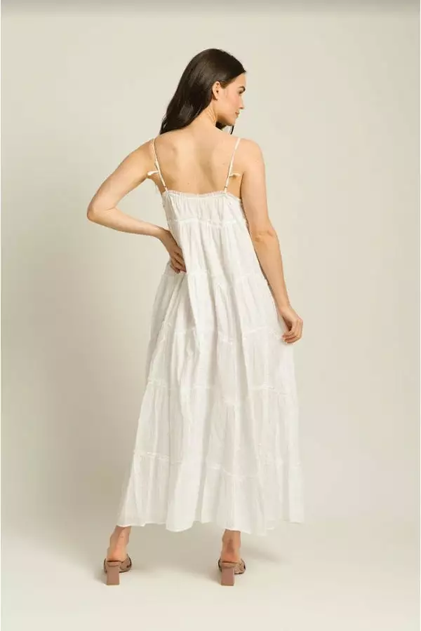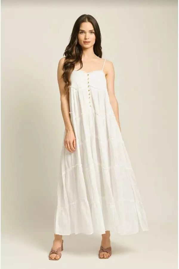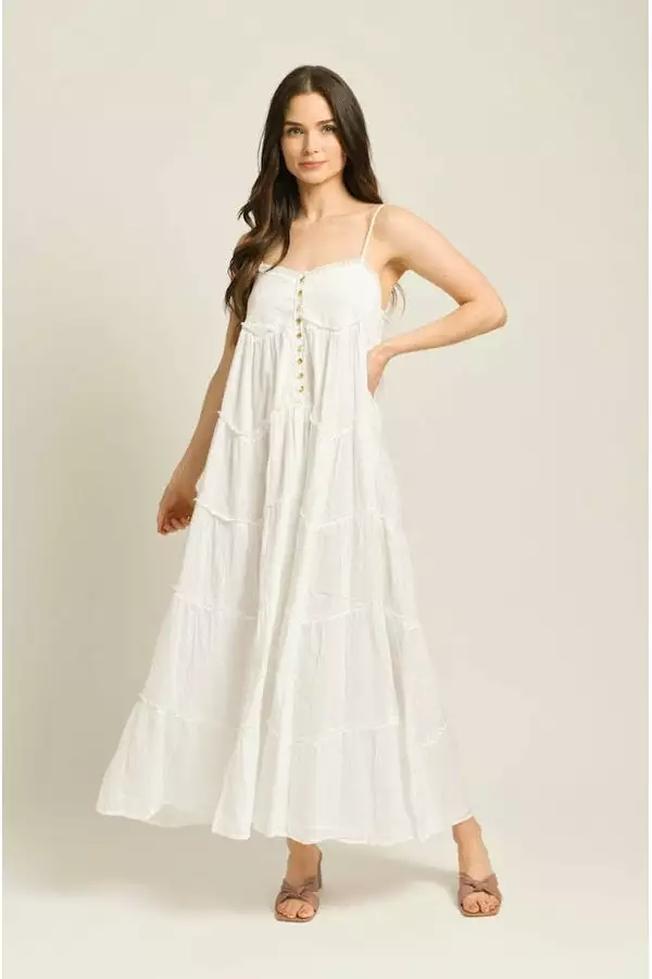 Boho beauty in flowing style! Adjustable straps meet a sweetheart neckline and gold buttons for a functional but feminine fit. Elevated by by zig zag tiered detailing, this is not your basic maxi dress.