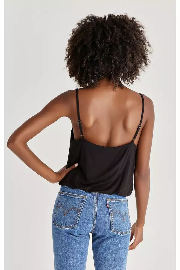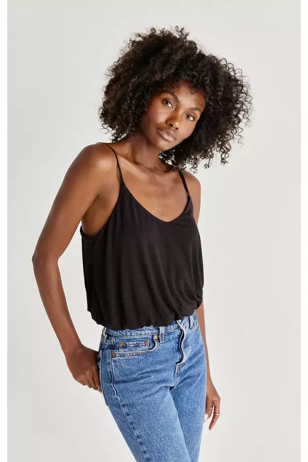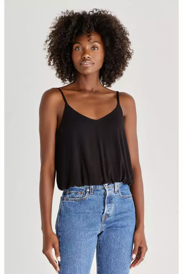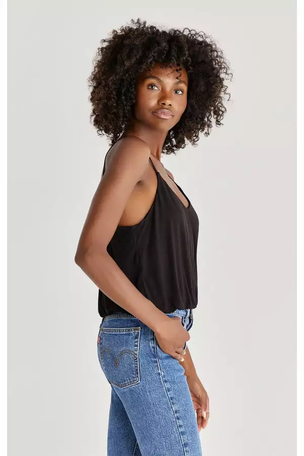 The Mirabel Tank is made from our ultra-soft Rayon Spandex Sleek Jersey knit fabric that features adjustable spaghetti straps, a soft v-neckline, and an elastic hem.